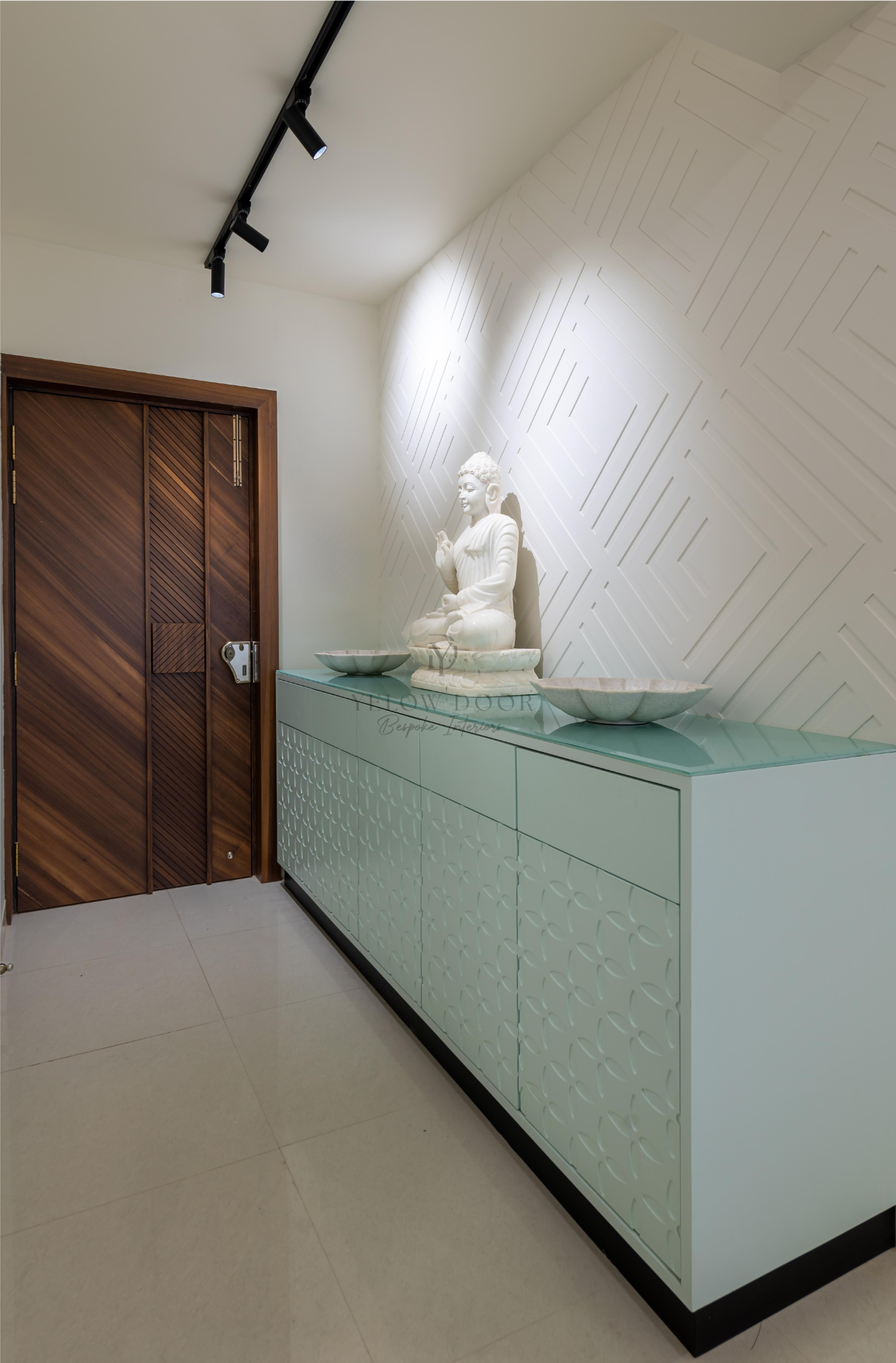 A neutral palette layered with warm wood tones, textured walls, and greenery gives the home a soft, organic feel. Statement lighting, custom furniture, and artful detailing bring sophistication while maintaining an inviting, lived-in atmosphere. From the cozy living area to the serene bedrooms and the minimalist entrance accented by a calming Buddha statue, every space has been thoughtfully crafted to feel timeless, soulful, and effortlessly elegant.